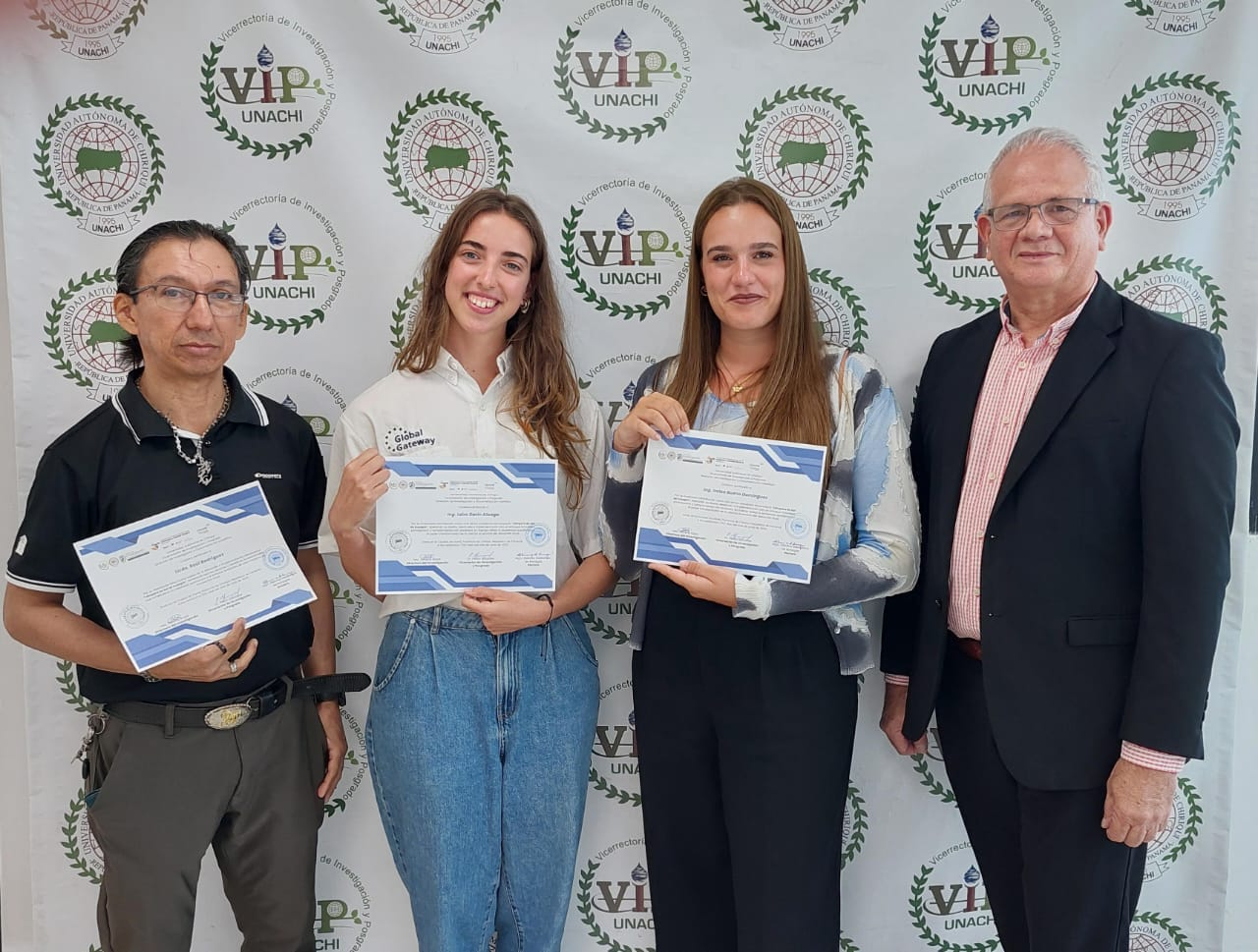 La Vicerrectoría de Investigación y Posgrado (VIP) de la Universidad Autónoma de Chiriquí (UNACHI), en conjunto con el Grupo de Investigación BIOFISAGRO y la Escuela de Física, ha entregado un merecido reconocimiento a las becarias españolas Iratxe Bueno Domínguez y Leire Garin Atxagra, así como al Centro de Competitividad de la Región Occidental (CECOM-RO), por su fundamental participación en el diseño y desarrollo de un prototipo de lámpara de agua salada de bajo costo.